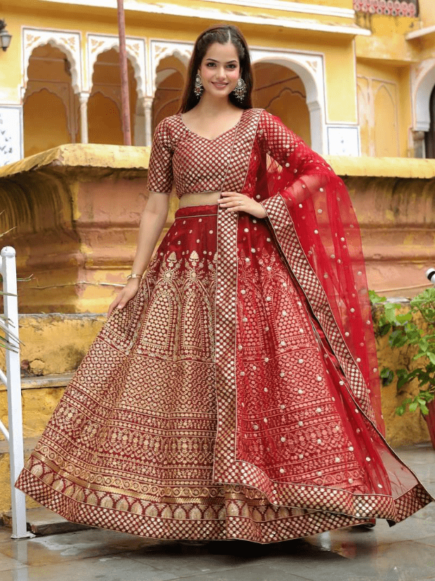 - Fabric and Embellishments: Lehenga are often crafted from luxurious fabrics like satin, and velvet, lehengas are adorned with intricate embroidery, sequins, beadwork, and other fancy decorative elements that enhance their beauty .